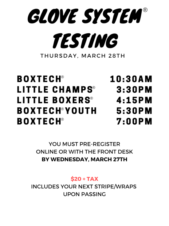 Read moreTHURSDAY, JANUARY 31 ST LITTLE CHAMPS® | 3:30 pm LITTLE BOXERS® | 4:15 pm BOXTECH YOUTH® | 5:30 pm BOXTECH® | 10:30 am & 7:00 pm $20 testing fee includes certificate & next stripe or wraps * You must pre-register for testing by Wednesday, January 30th! Walk-ins will NOT be able to test. Pre-register HERE Regular Boxtech classes will NOT be […]