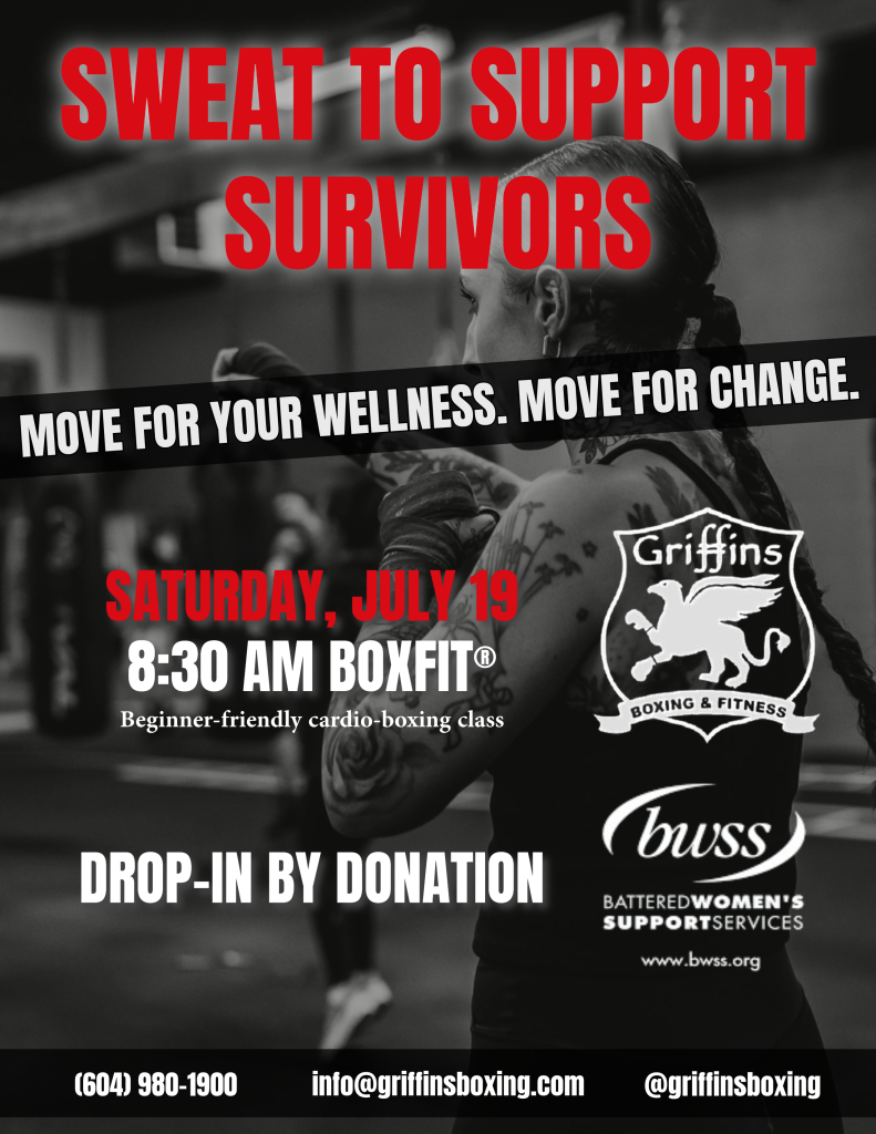 We’re hosting a beginner-friendly, non-contact cardio boxing pop-up class in support of Battered Women’s Support Services’ Sweat to Support Survivors campaign! This special class is open to everyone by donation.❣️